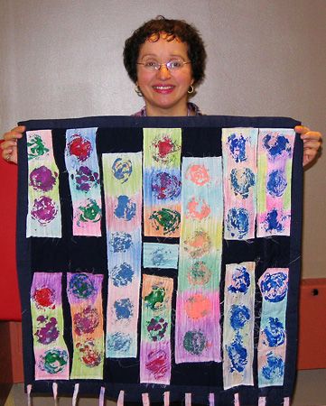 Play with your Vegetables! by Sandra Samaniego Painted fabric scraps. The cut bottom of a celery stalk was used to stamp paint onto fabric. Machine quilted. Click here to see another image. |